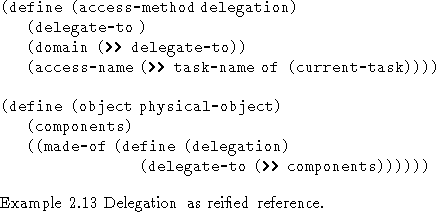 The reflective constructs task-name and current-task are bound to the run-time binding of a method and return the name of the feature in which the method is being applied. Once the name of the feature is known delegation simply establishes the reference to the object specified to be delegate-to. A more powerful use of delegation is with default metalevels (cf. below § 2.4.4).